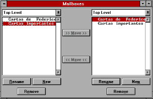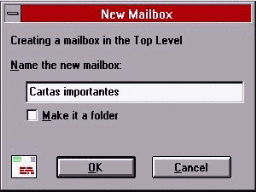 En la primera figura vemos como se crea un buzon desde el menu MAILBOX. Y en la siguiente, vemos otra posibilidad de crear un buzon, pero que ademas nos permite otras operaciones como renombrar y borrar buzones, ademas de poder transferir mensajes entre ellos. Esta posibilidad es seleccionada desde el menu SPECIAL, y luego eligiendo la opcion MAILBOX.